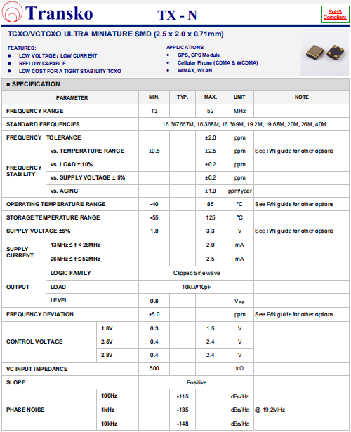 Transko晶振,TX-N晶振,低電壓振蕩器.有源晶振,是只晶體本身起振需要外部電壓供應,起振后可直接驅動CMOS 集成電路,產品本身已實現(xiàn)與薄型IC(TSSOP封裝,TVSOP封裝)同樣的1mm厚度,斷開時的消費電流是15 µA以下,編帶包裝方式可對應自動搭載及IR回流焊接(無鉛對應)產品有幾種電壓供選1.8V,2.5V,3V3.3V,5V,以應對不同IC產品需要.