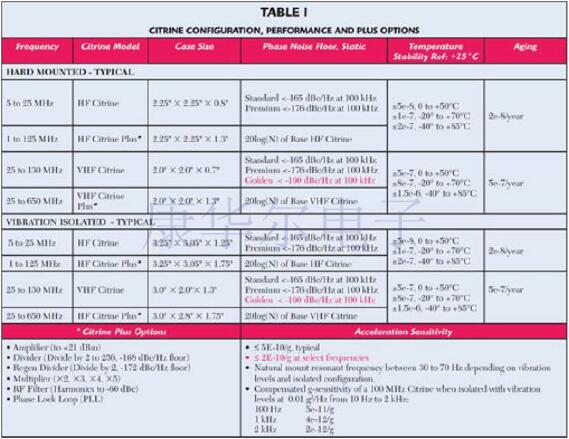 新型Citrine系列晶體振蕩器專為在要求靜態(tài)和動態(tài)條件下具有低相位噪聲性能的最苛刻應(yīng)用提供廣泛的貼片晶振產(chǎn)品.黃水晶振蕩器可以配置為1~650MHz之間的任何固定頻率.黃水晶系列有八種配置.低頻HF振蕩器和VHF振蕩器均可使用,也可以不使用隔振系統(tǒng).而且,“PLUS”系列還提供HF和VHFCitrines,當(dāng)應(yīng)用需要額外的功能時,可添加乘法器,分頻器,放大器,濾波器和雙輸出. Citrine系列具有多種包裝配置,可以根據(jù)頻率,所需的選件,性能規(guī)格和其他應(yīng)用注意事項進(jìn)行選擇.有關(guān)標(biāo)準(zhǔn)Citrine配置和性能選項,請參見表1. 黃水晶靜態(tài)相位噪聲性能