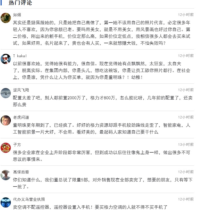 根據(jù)格力官方銷售平臺(tái)顯示,目前只賣出5臺(tái),這款手機(jī)據(jù)說是董明珠親自代言做廣告,手機(jī)開機(jī)畫面即為董明珠本人,希望能讓國(guó)人愛上中國(guó)制造。這銷量可真是震驚了整個(gè)手機(jī)界。之前董明珠大膽放言:“華為賣老大,我就賣老二嘛。”但是,理想很美好,現(xiàn)實(shí)卻很殘酷。董明珠的豪言與現(xiàn)在目前銷量上很不符合,由此,各種聲音此起彼伏“董大媽對(duì)于這你真不怕被打臉么?”借助網(wǎng)友的話,"那個(gè)開機(jī)畫面,實(shí)在是看著心累,董大媽太搶鏡。""建議董大媽不要再折騰做手機(jī)了,好好做格力空調(diào)吧,把空調(diào)質(zhì)量再進(jìn)一步的完美"等等之類的話,可讓網(wǎng)友們操碎了心,我們來看看網(wǎng)友的一些評(píng)論,此評(píng)論來源由騰訊網(wǎng):