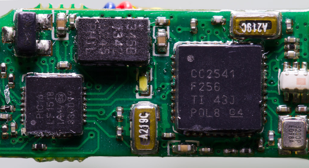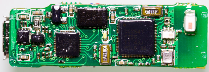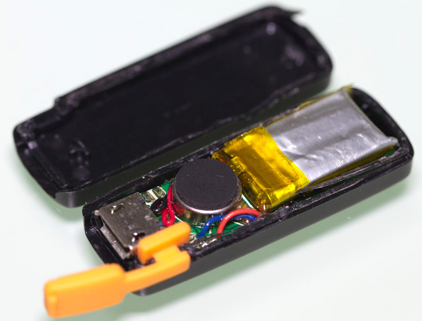 現(xiàn)在就來拆拆手環(huán)主機(jī)了,由于手環(huán)外殼采用熱熔接方式,要拆開手環(huán)只能采用暴力方式拆解.揭開外殼,可以看到智能手環(huán)主機(jī)電路板和零件,從MicroUSB膠塞固定位置上可以看到膠塞頭并沒有完全密封起來,如果游泳時(shí)帶著這個(gè)手環(huán)進(jìn)入水中可能會導(dǎo)致進(jìn)水.