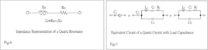 在這種振蕩電路中,石英諧振器作為感抗Xe和電阻Re的串聯電路工作,如圖6所示,其振蕩頻率由下式表示: